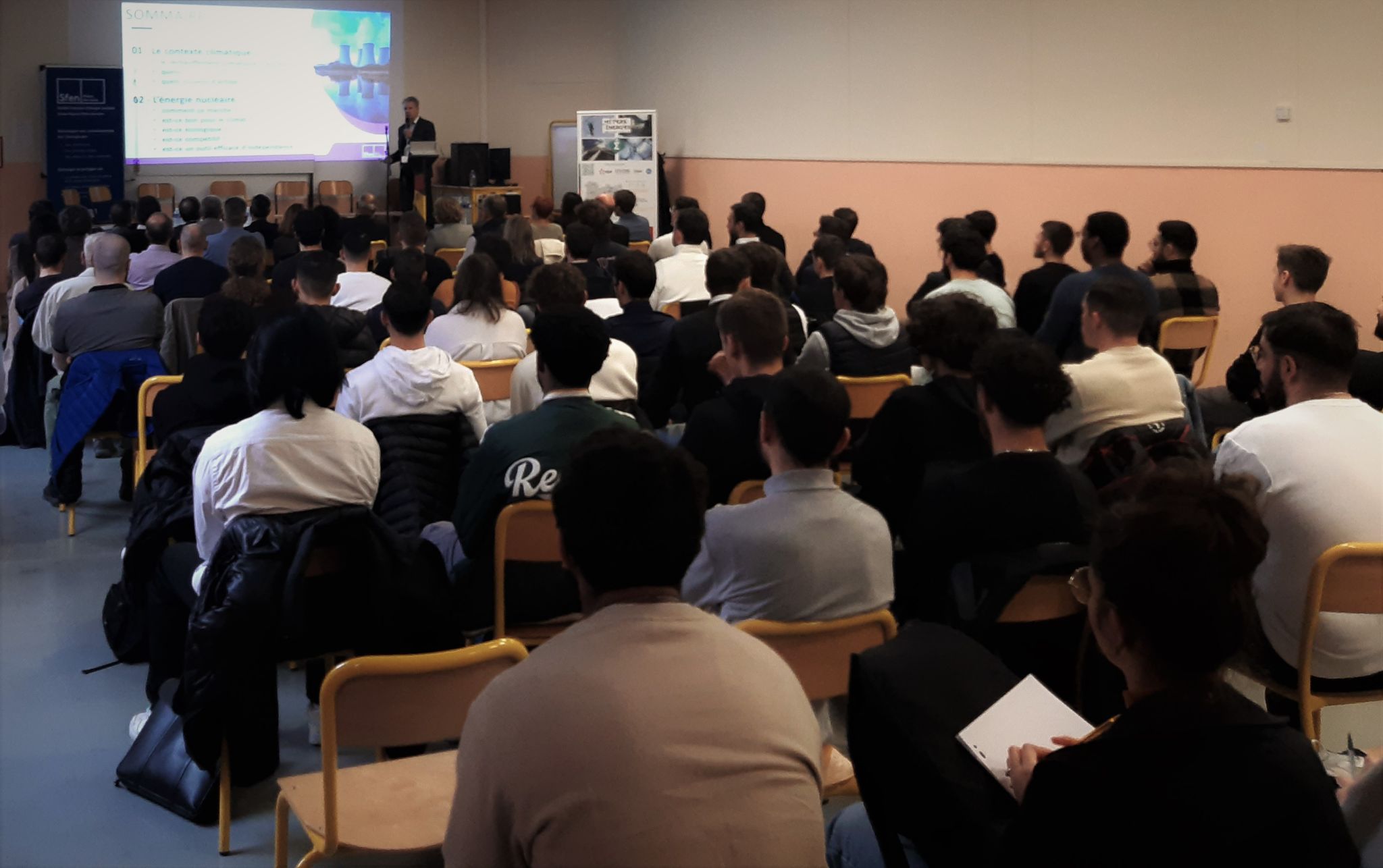 Devant le groupe Energie des Ingénieurs Arts et Métiers (ECAM et ENSAM) dans les locaux de l'ECAM de Lyon. Le monde doit faire face à des besoins en énergie sans cesse croissants. Sortir du « tout fossile » implique un effort important pour promouvoir à la fois les économies d’énergie et des sources énergétiques non émettrices de gaz carbonique. Parmi ces dernières les « renouvelables »ont un avenir certain, mais, compte tenu de leurs limites, il est aussi impératif de faire appel à l'énergie nucléaire.