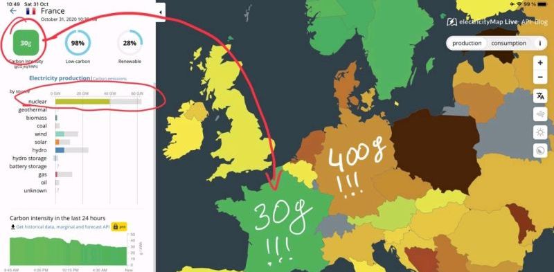 Il y a les promesses de prétendus écologistes au service d'une idéologie, les discours des politiques à la recherche de votes,... et il y a tout simplement les faits, incontestables : voiçi les émissions de CO2 du mix électrique le samedi 31 octobre 2020, en France et en Allemagne : 30g vs 400g !