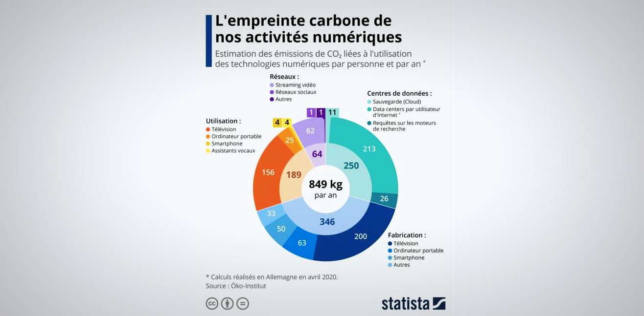 Cette infographie de Statista reprend une estimation détaillée de l'institut allemand de recherche sur l'environnement (Öko-Institut), qui a chiffré les émissions moyennes par personne pour différents postes, et donne un aperçu de la répartition de l'empreinte selon le type d'appareil et d'activités pour des populations ayant un niveau de vie et de consommation similaire.